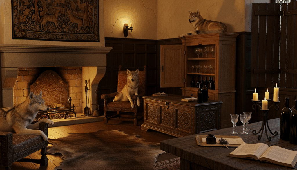 Grughilda checks for any sounds from the next room and thinks she may have heard a faint scritching sound, then kicks the door open to find a den with a fireplace and a large stag’s head mounted above it, resembling a hunter’s den. The room also contains taxidermied wolves on wooden pedestals, a desk with animal skin rugs, and cabinets, one of which has a very obvious padlock on it. Zandarius finds rat droppings behind one of the wolves and decides to cast a spell called Mystic Armor, giving himself a ward of magical energy.
