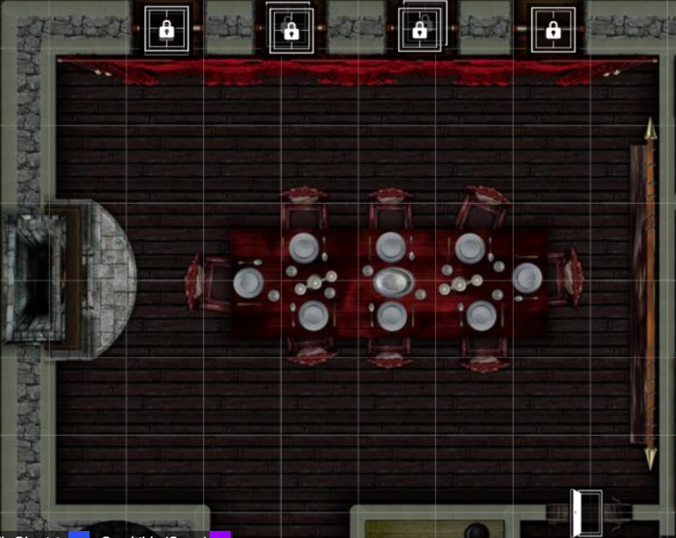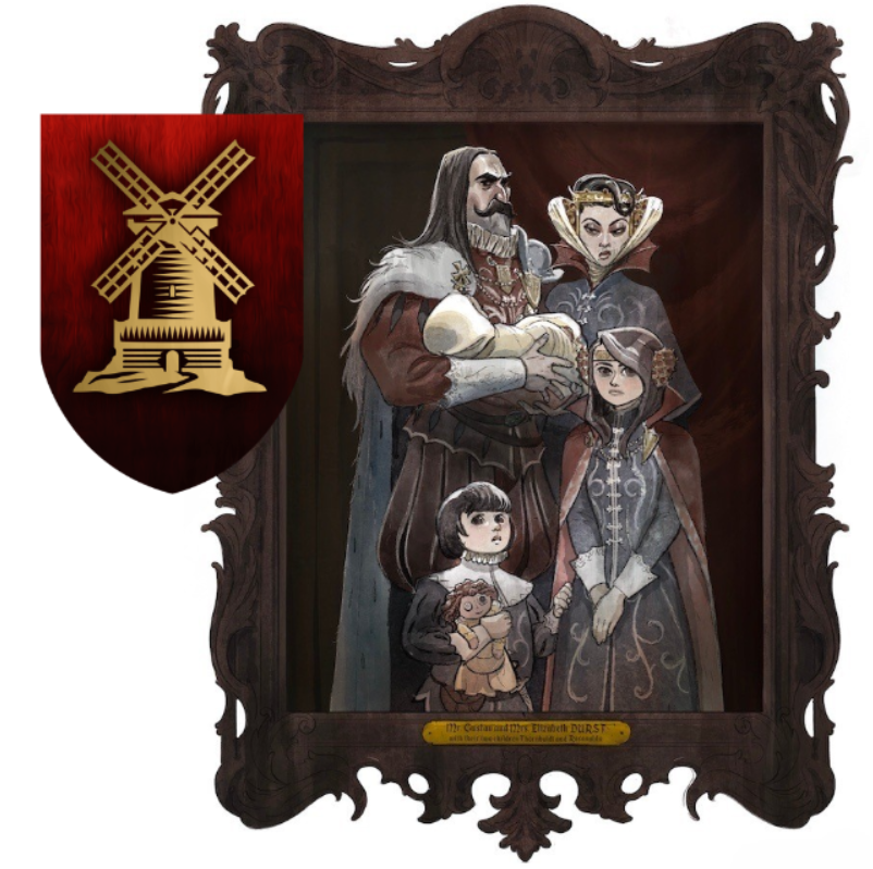 The front door proves to be similarly open, but the group can’t see much inside without light, despite their dark vision. As they step inside, they see a foyer with a door at the end, and they notice a coat of arms on a shield and a painting on the wall, which appears to be a family portrait of Mr. Gustav and Elizabeth Durst with their two children: