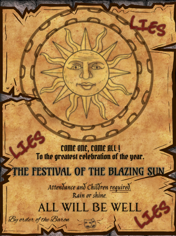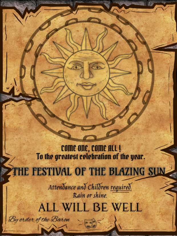 - The upcoming Festival of the Blazing Sun in three days is a major event with forced participation, intended to placate the Count.
