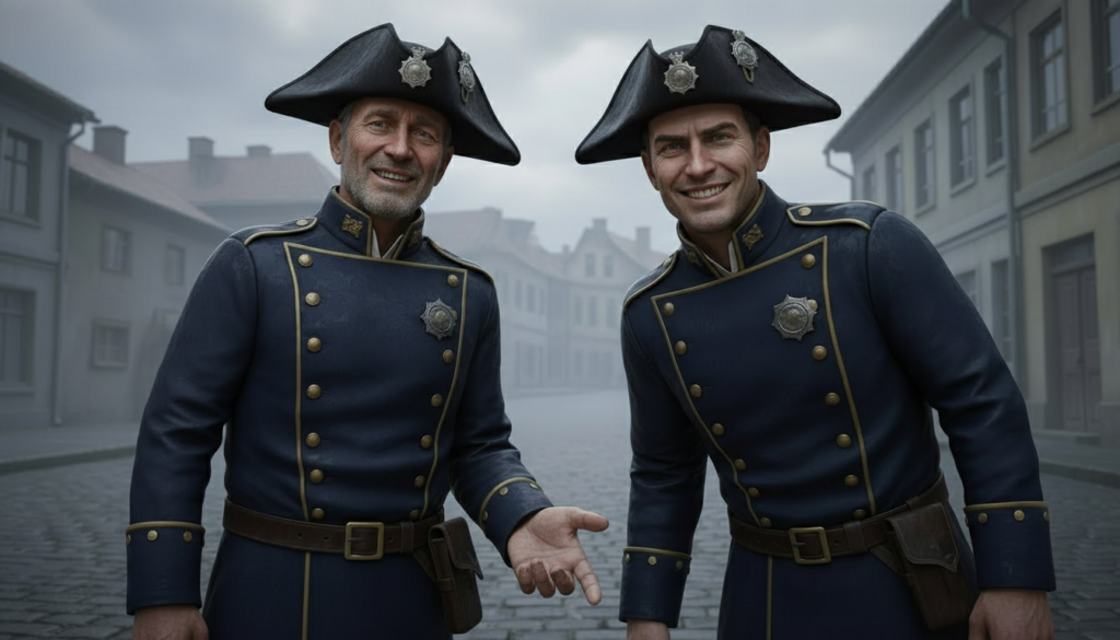 - The constables maintain the façade of forced cheer but reveal underlying tension and fear of subversive elements.