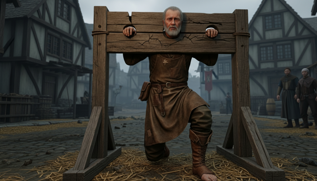 - The man in stocks is a cobbler, punished for refusing to feign happiness, mourning his deceased wife.