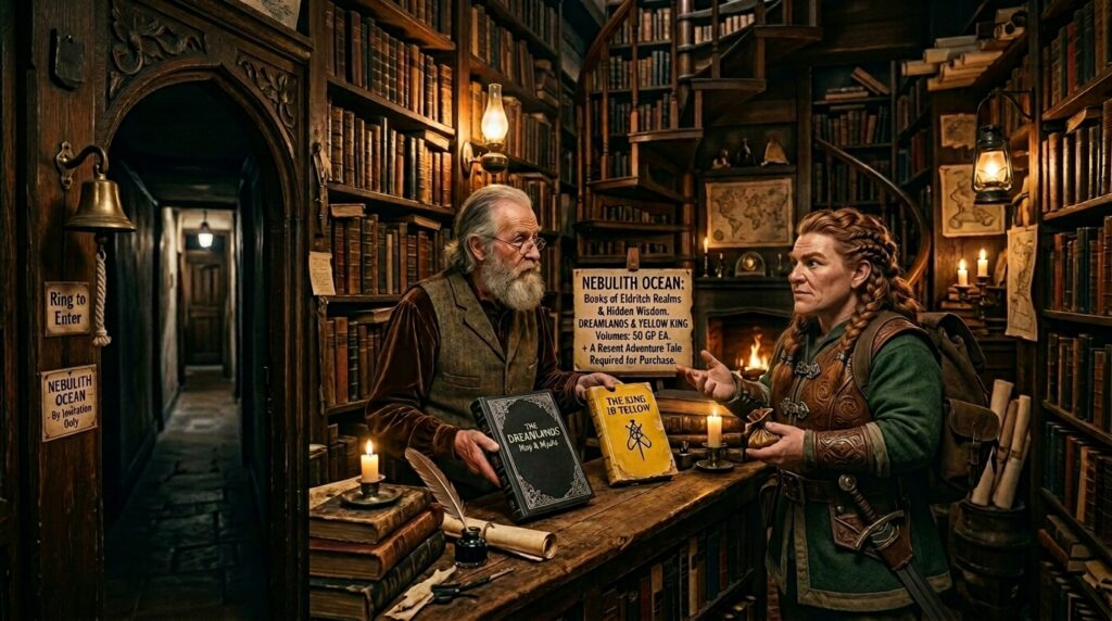 Andi explores various magic shops and bookstores seeking information on the Dreamlands, the Yellow King, and related cults. Most shops cater to novice mages and contain common spells and histories. She discovers a hidden bookstore named “Nebulith Ocean,” accessible by ringing a bell and entering a secretive hallway. Inside, an elderly knowledgeable bookseller offers rare books on the Dreamlands and the Yellow King for 50 gp each, with a requirement to share recent adventures as payment. The group acquires four rare books, including one about demonic commerce and exploitation, which provides insights on demonic influences and trade in the Dreamlands. Andi begins transcribing the books into common language for easier understanding.