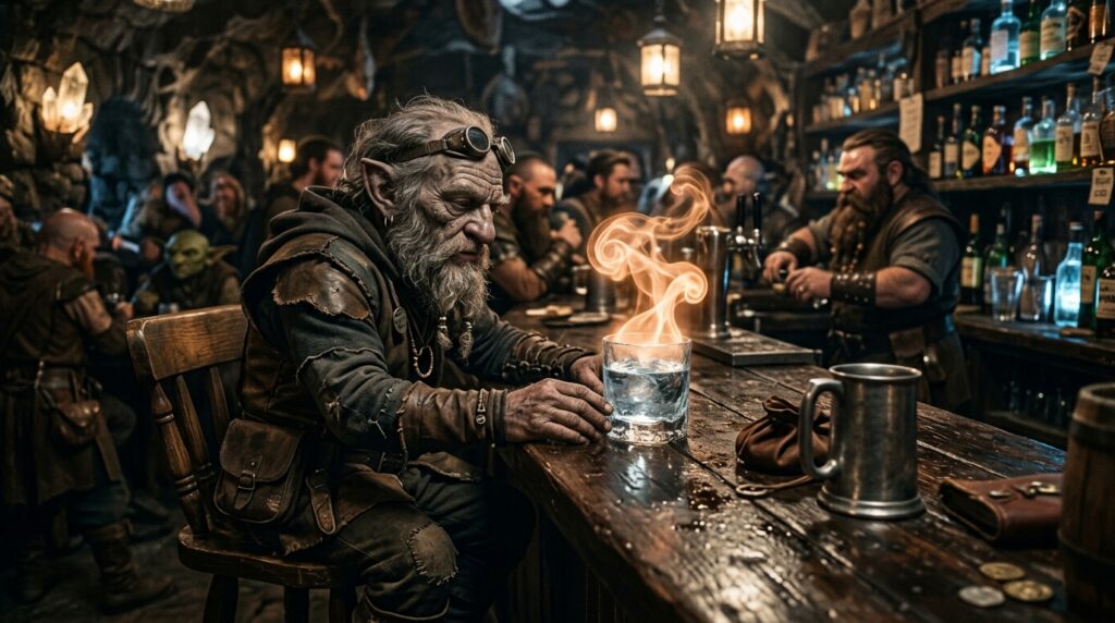 Elib attempts to drink a rare and potent beverage called “Deep Gnome Everclear,” produced by deep gnomes, which few have successfully consumed. The drink appears as a clear liquid with strange orange fumes and causes intense effects resembling being hit by a brick, followed by a recovery phase. Elib successfully passes fortitude and wisdom saves, impressing the crowd and earning a place on a bar plaque. A challenge is issued for another drink, with bets placed and consequences for failing including unconsciousness or permanent intelligence loss. Elib wins the fortitude save but fails the will save, suffering a permanent -1 intelligence penalty, reducing his intelligence score. The group discusses possible magical remedies like Restoration or Regenerate spells to heal the damage, though physical brain damage may be difficult to remedy.